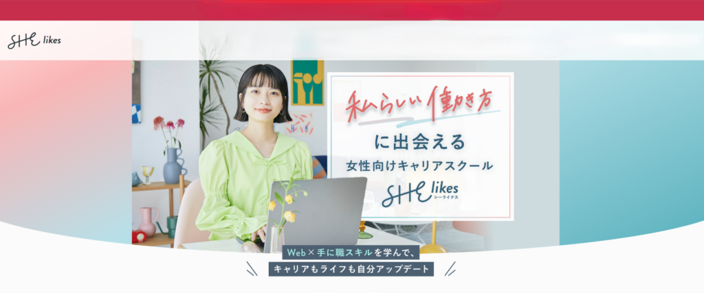 SHElikesは、女性向けキャリアスクールとして高い人気を誇るオンライン学習サービスです。Webデザインやライティング、動画編集、マーケティングなど、全45種類以上の職種スキルを定額で学べるのが大きな特徴です。