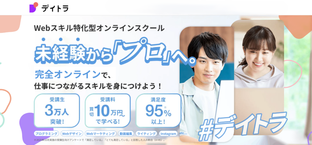 デイトラは、実務レベルのスキルを低価格で学べる買い切り型のオンラインスクールです。Web制作やプログラミング、デザインなど、現場で求められるスキルに特化している点が特徴です。