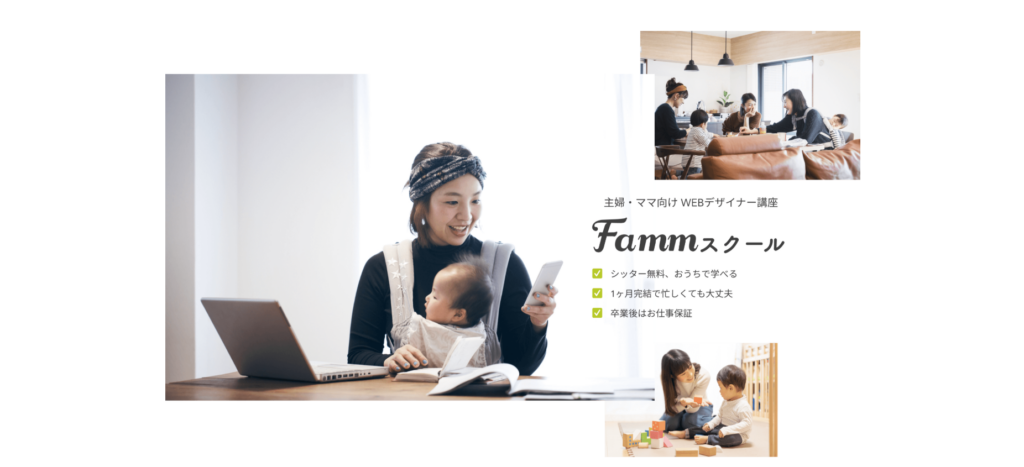 Fammスクールは、ママ専用の短期集中型Webデザインスクールです。1ヶ月という短期間で基礎を学べるため、忙しい主婦でも取り組みやすいのが特徴です。