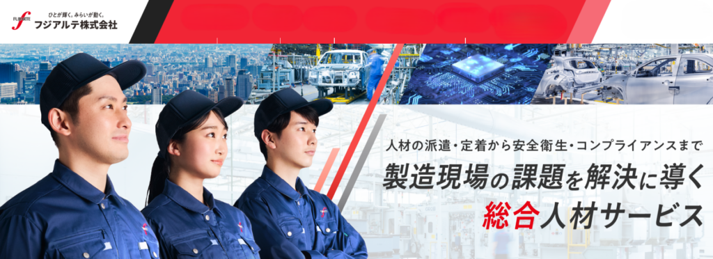 フジアルテは、製造業専門の人材サービス企業として長年の実績を持ち、高時給案件や寮付き求人を多数取り扱っています。特に工場勤務の分野に強く、安定した仕事を求める方に適しています。