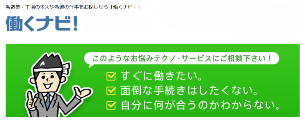 テクノ・サービス(働くナビ!)は、製造業・軽作業に特化した求人を多数取り扱う大手派遣会社で、全国規模で豊富な案件を保有しているのが特徴です。特に工場勤務や検品、仕分け、組立などの仕事に強く、未経験からでもスタートできる案件が豊富に揃っています。
